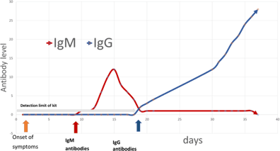 Fig.1 – Approximate IgM and IgG antibody levels over time – Not actual data – for illustration purposes only