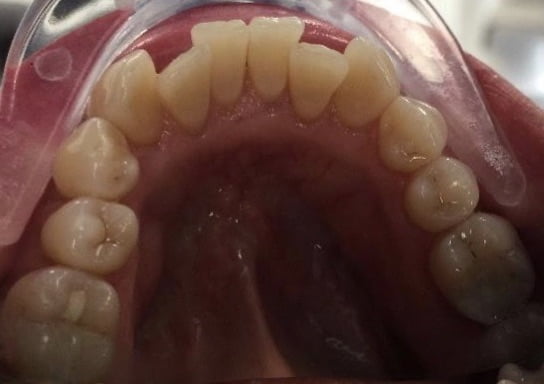 We noted mild upper crowding with porcelain crowns and uneven margins with moderate lower crowding and the LR2 being hidden in the smile.