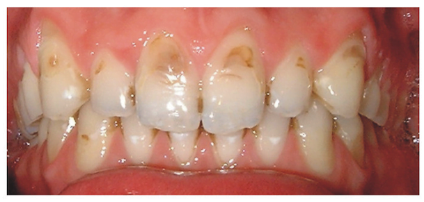 Initially the teeth may looks shiny or have translucent edges, but eventually you start developing pits and cavities as above.