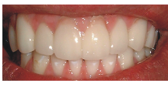 2 weeks later new porcelain Emax veneers were bonded to the teeth. You may notice some pink porcelain at the gum levels; we use this when there has been gum recession and the patient does not want extremely long teeth.