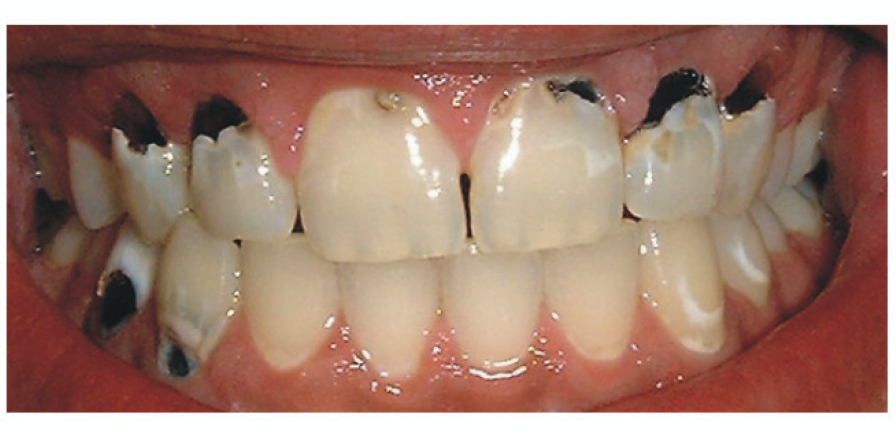 This interesting case is an 18 year old male who used to drink Coke every day. He rarely brushed his teeth during his teenage angst days and slowly developed dark cavities.