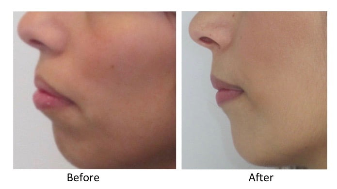 The lip profile can be seen to have a reduced angle between the base of the nose and the upper lip. The lips can be seen to be actively trying to close the mouth.