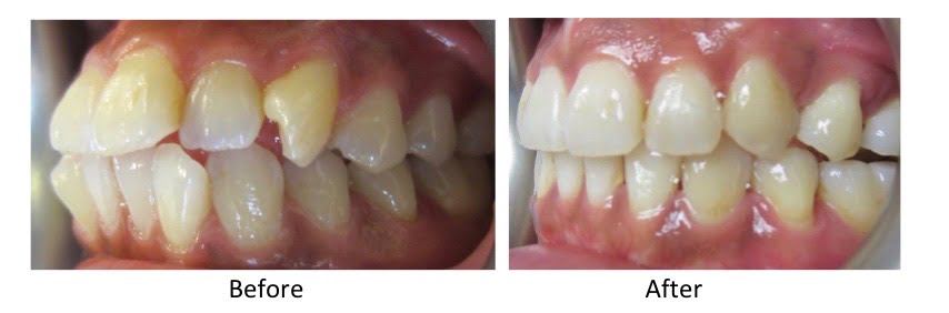 The best option is the removal of 2 upper and 2 lower premolars. This can give a total of 5-10m of space allowing the front teeth to be angled backwards to near vertical.