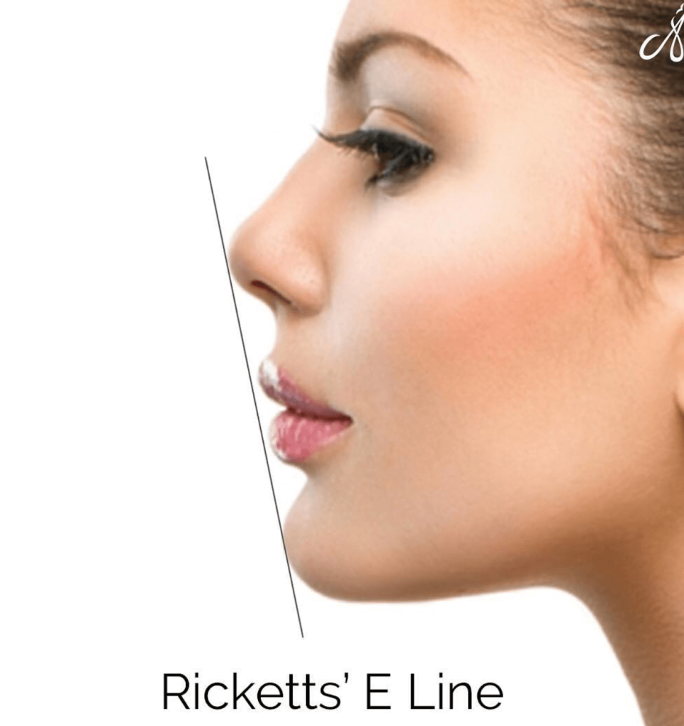 The E line is an imaginary line drawn from the nose tip to the chin. In the ideal face the upper and lower lips sit just behind the E Line, with the lower lip being fuller being closer.