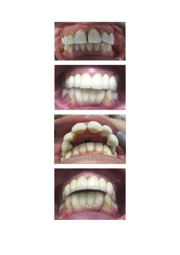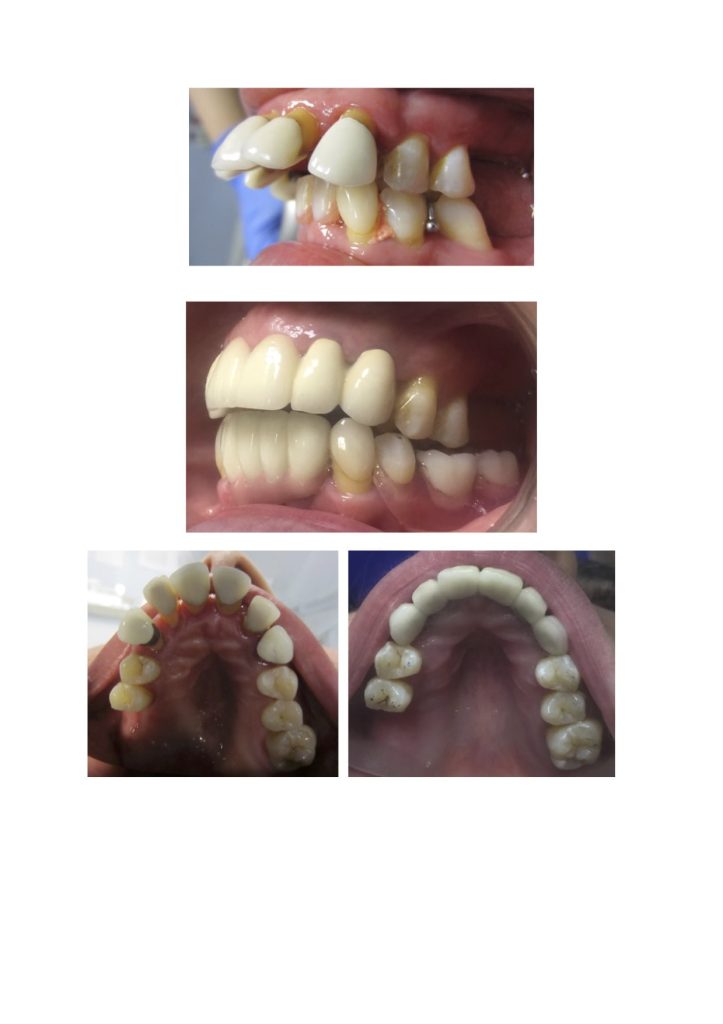After 8 months we were able to replace the dentures with an upper 6 unit metal porcelain bridge which was screw retained, and a lower 4 unit metal porcelain screw retained bridge.